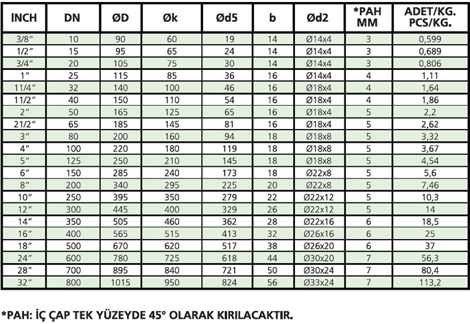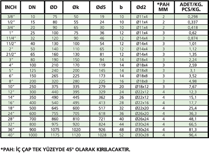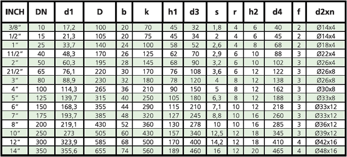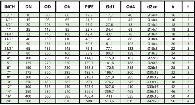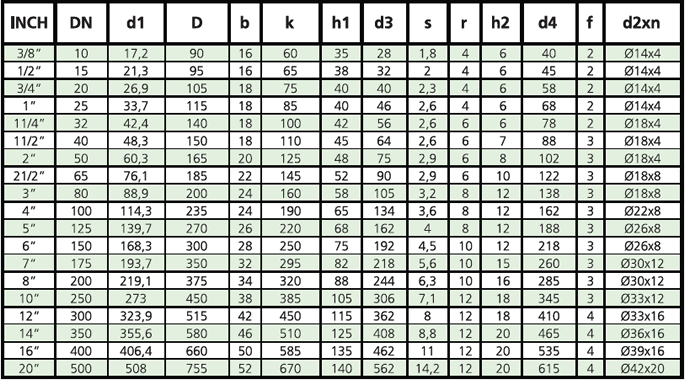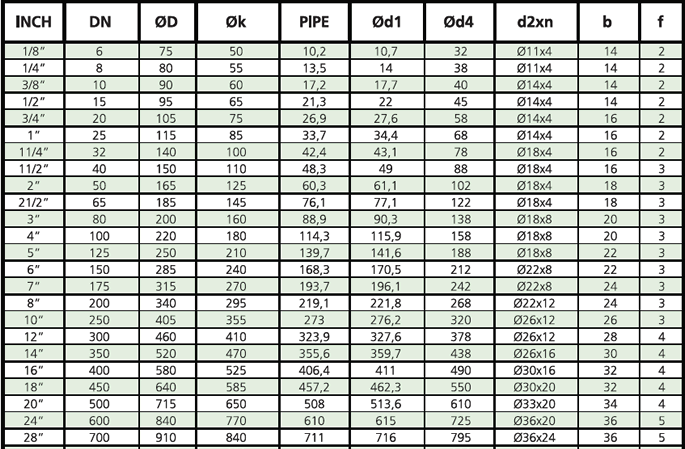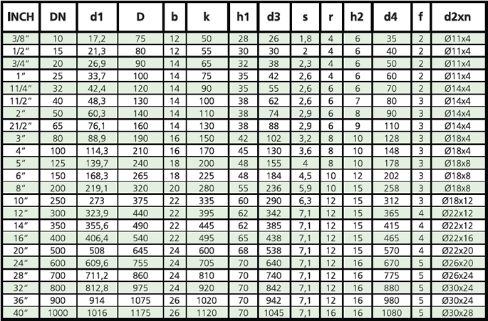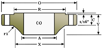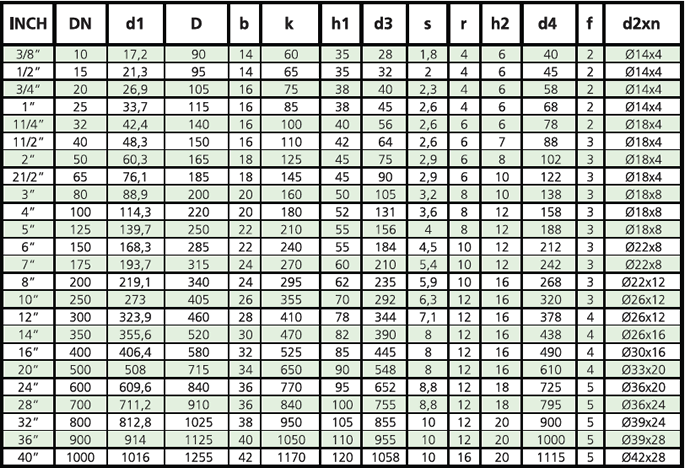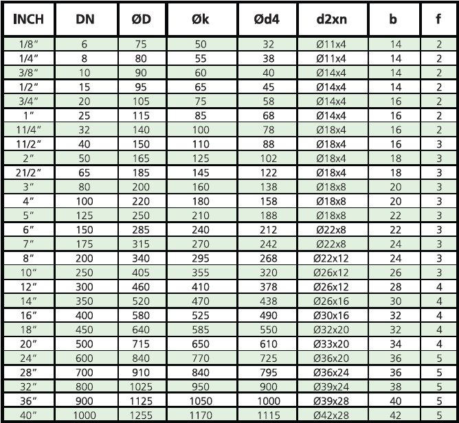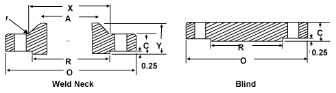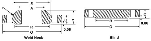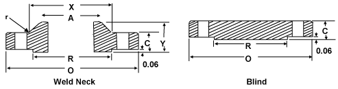 | OD | WELD NECK | BLIND | LTH | DIA AT BASE | DIA BEVEL | OD RF | BOLT CIRCLE | # HOLES | DIA HOLES | FILLET RADIUS MIN | WELD NECK | BLIND | |