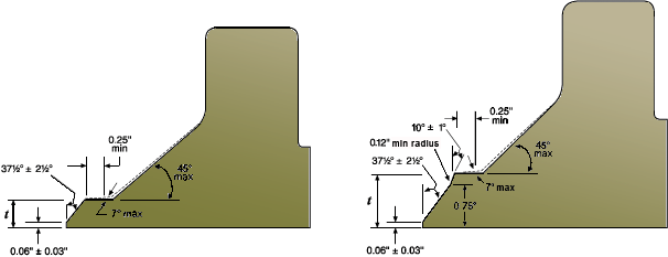 | Bevel for wall thicknesses (t) from 3/16" to 7/8", inclusive. | Bevel for wall thicknesses (t) greater than 7/8". |